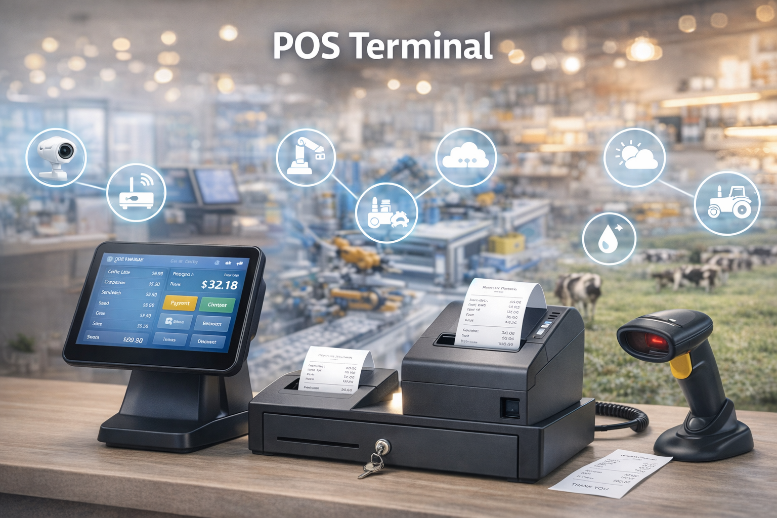 POS Terminal, Receipt printer, Cash drawer, Scanner